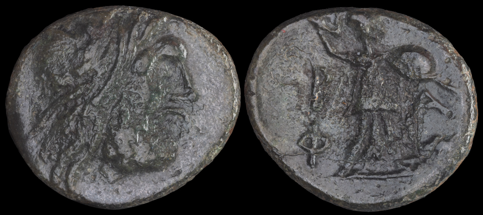 Rev: Athena standing right holding spear and shield; B – A to either side, Θ at bottom left and thunderbolt at bottom right