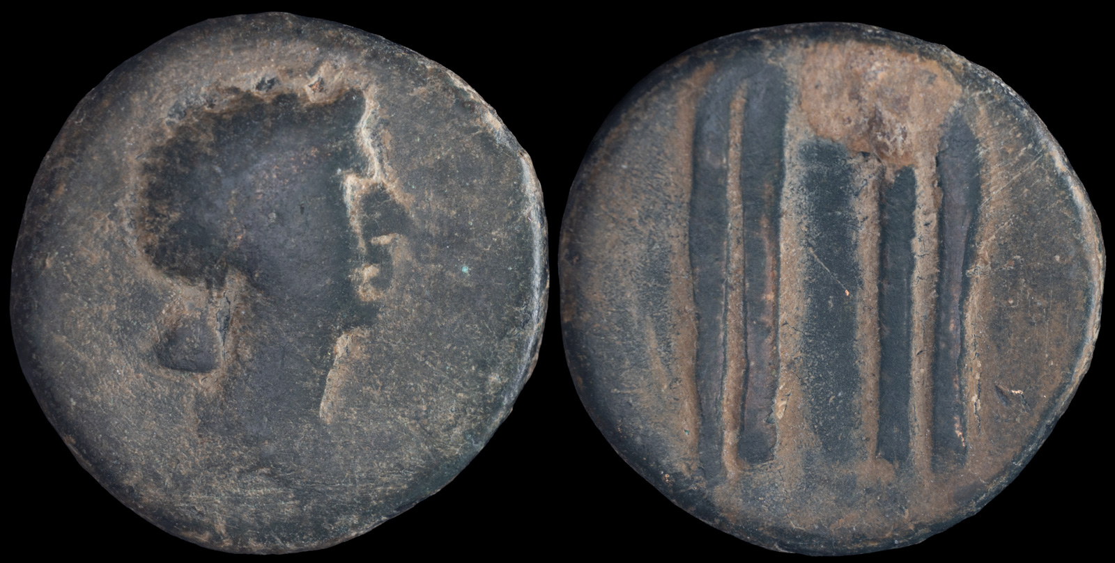 reverse aerial view of the city walls of Artaxata, in the shape of an octagon, with six tall round defense towers and two gateways, [E – Γ] (Greek: regnal year 3) above