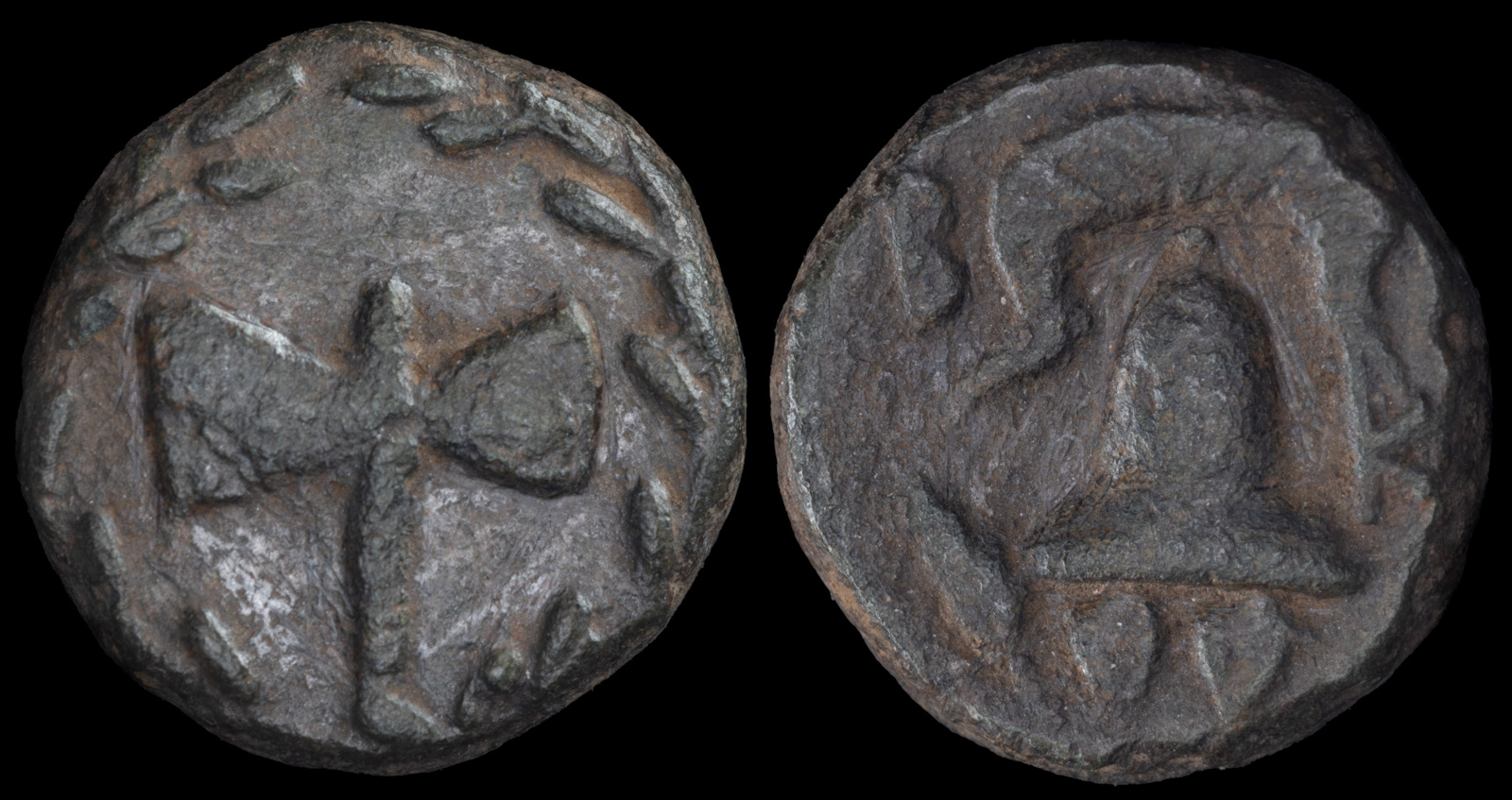 Macedonian helmet; grain ear to left, K to right