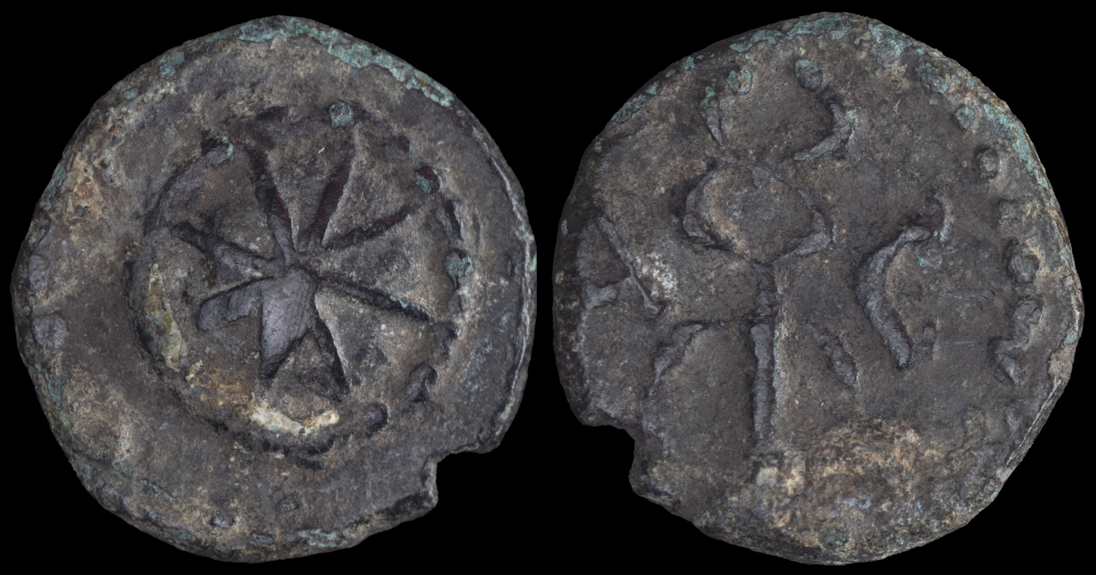 Rev.: EΣTFEΔIIYΣ; Slinger in throwing stance right; triskeles to right; all within pelleted square border.
