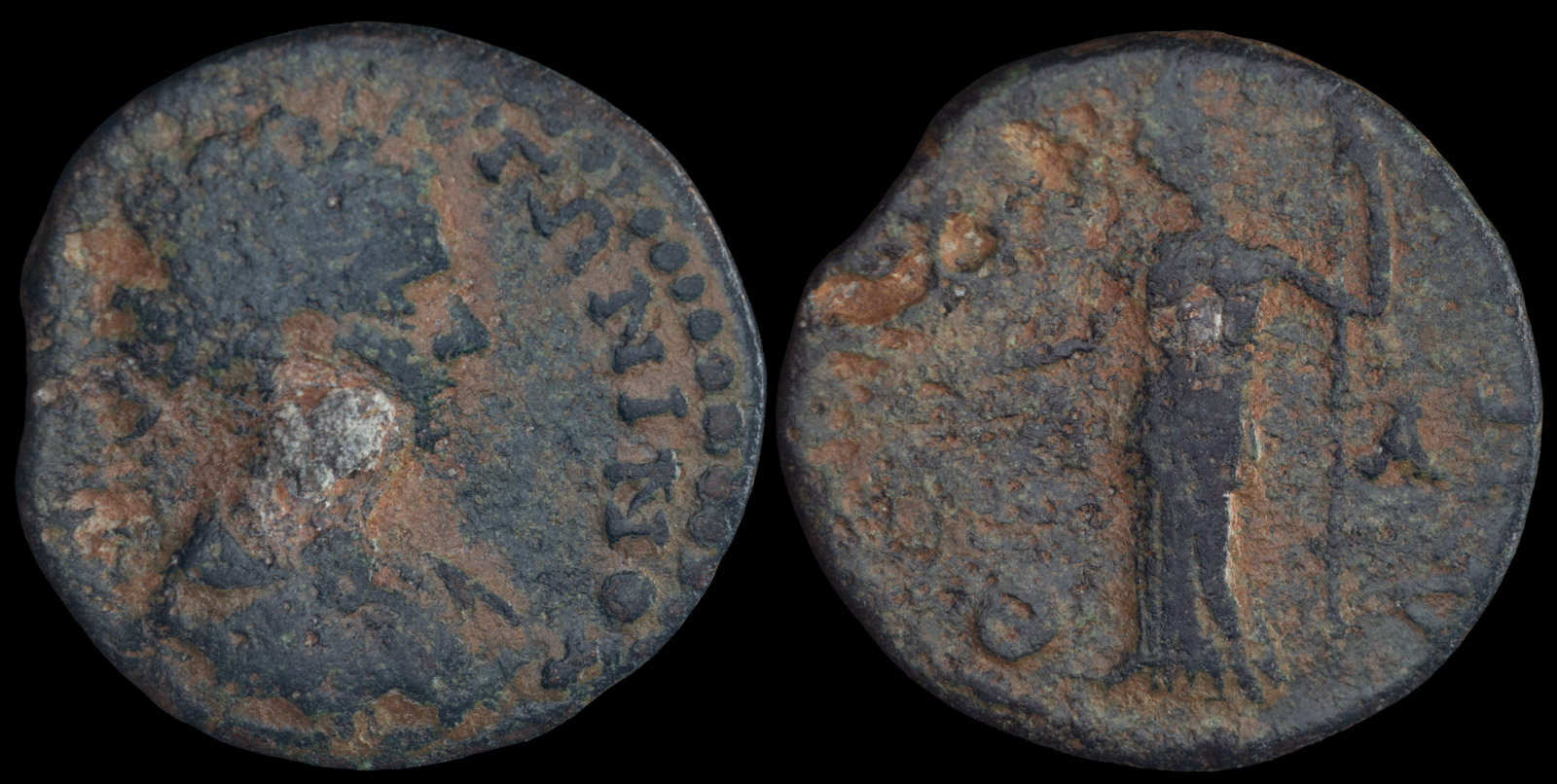 Rev. ΘOV-PI-ATΩN Athena standing to left, holding a spear and patera, Λ-Α across fields