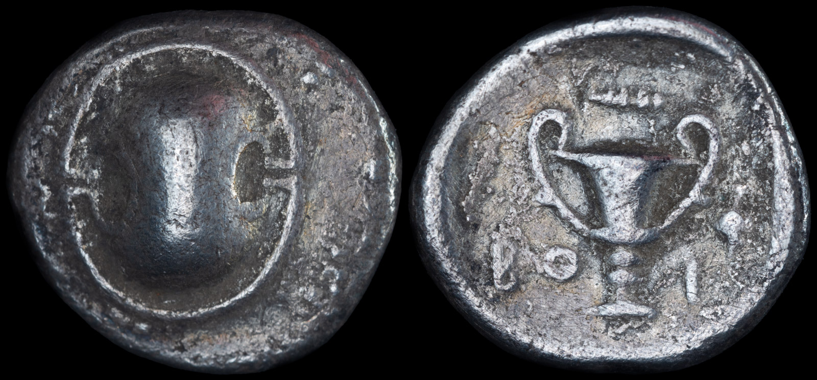 Rev. BO – I Cantharus; above, club and in r. field, bunch of grapes; all within incuse square.