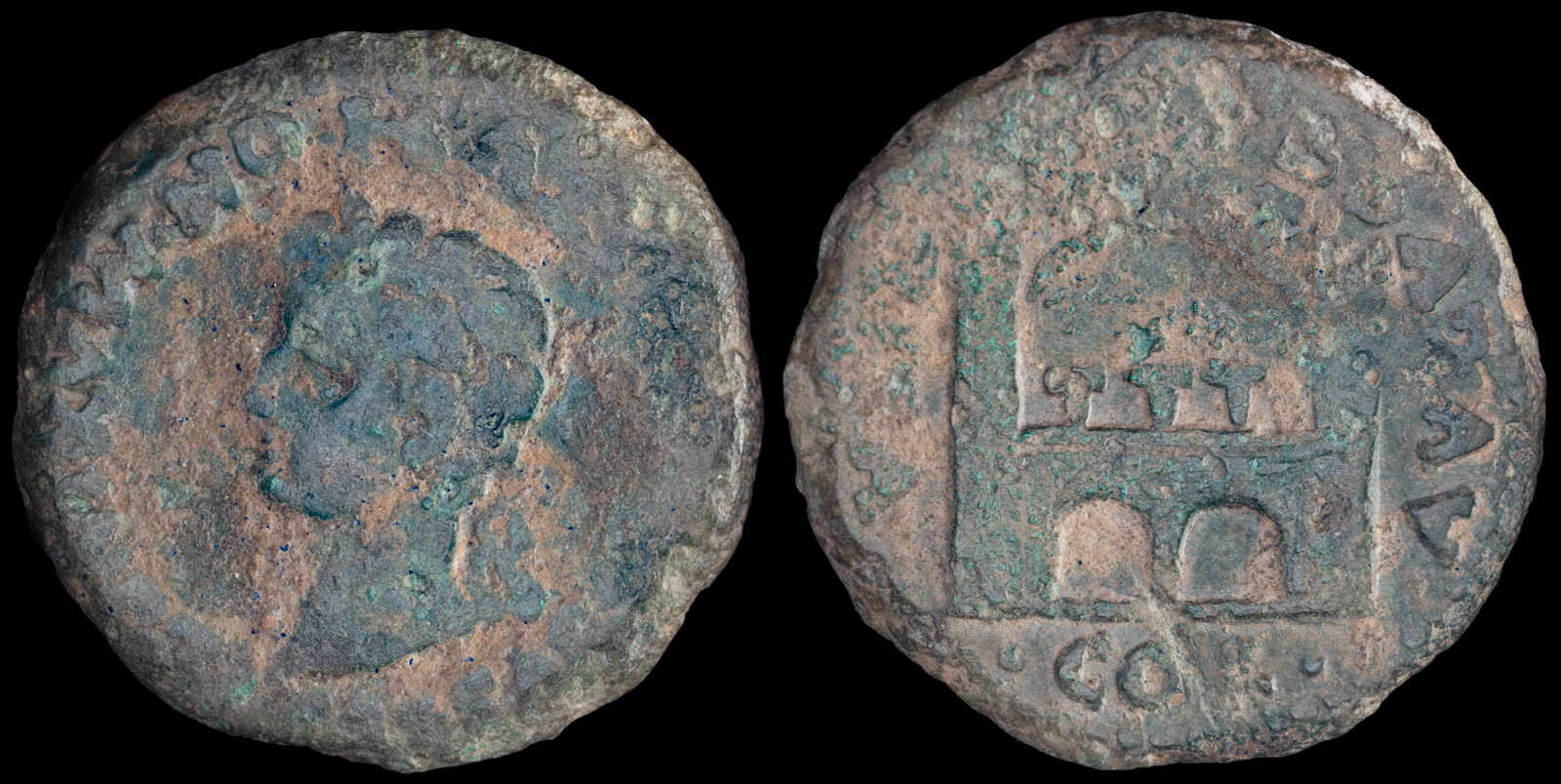 In 22 BCE, the Asturians revolted against Carisius, according to historians due to his cruelty. The uprising was quelled, but Augustus removed him from his position. Carisius minted a large number of silver coins, but also minted bronzes such as this one. The bronzes seem to be rarer.