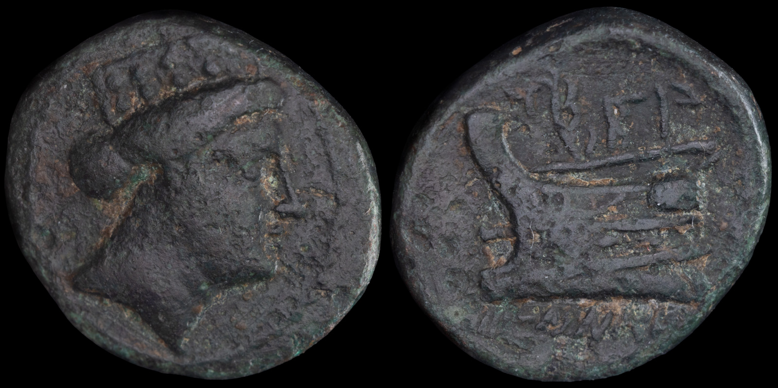 Prow of a galley left, date below in Phoenician, “ΓB” monogram plus two others above