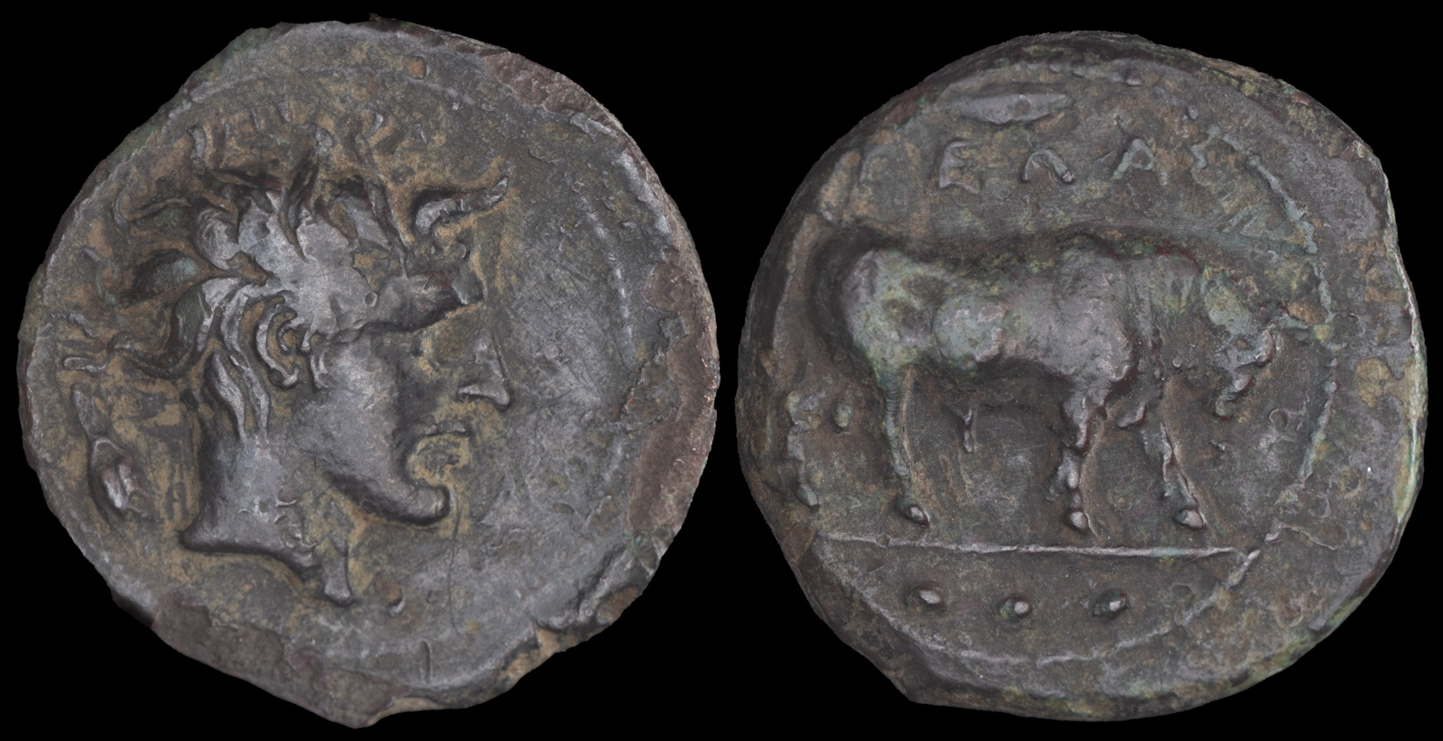 Obv: ΓΕΛΑΣ, Bull standing right; barley grain above; three pellets (mark of value) in exergue.