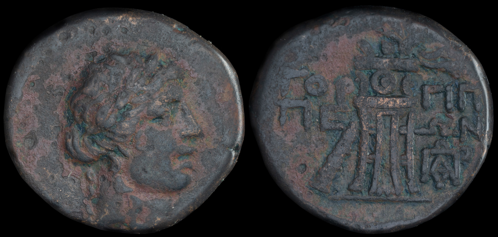 Obv. Head of Dionysos right, wearing ivy wreath
