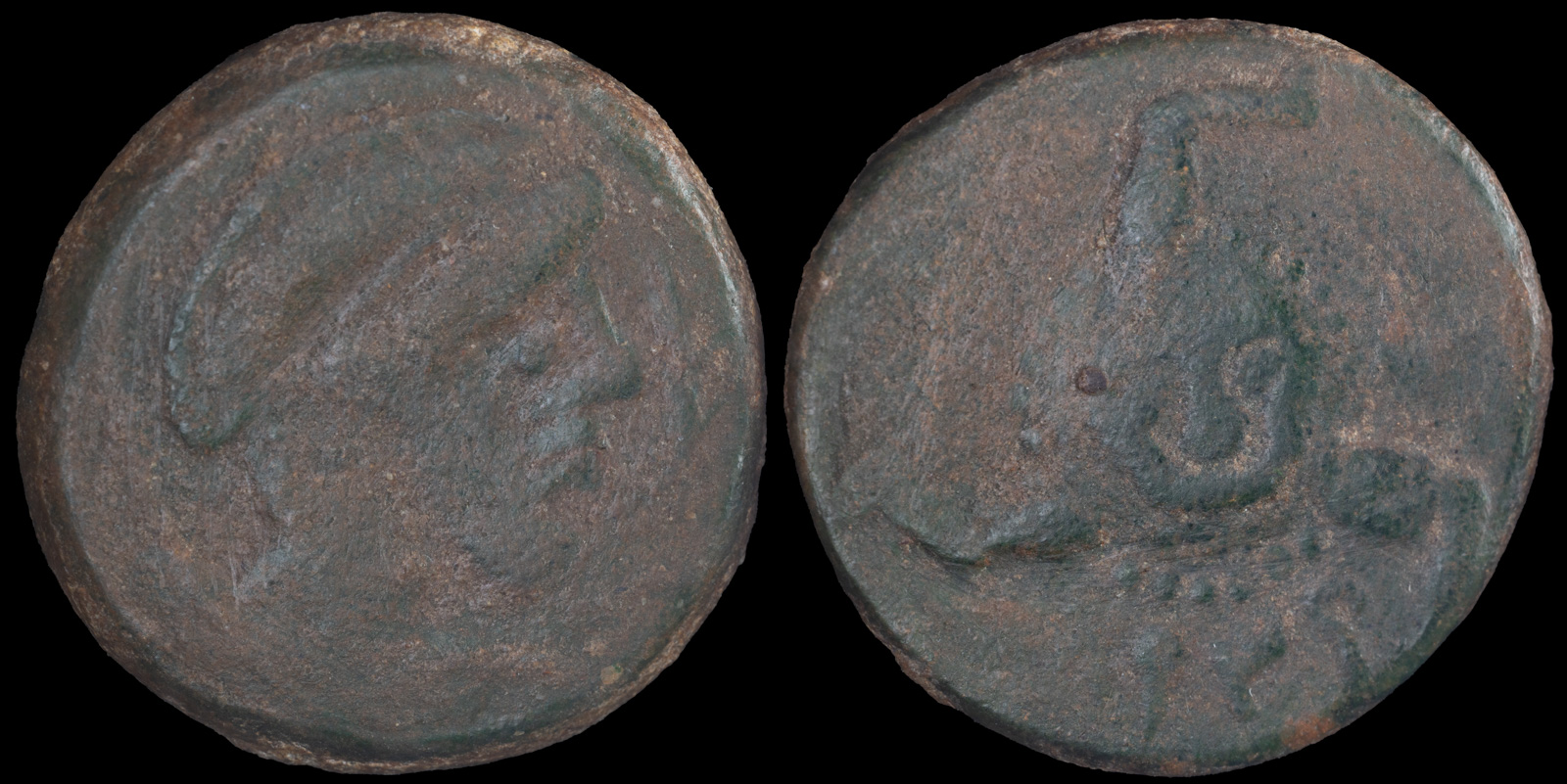 Obv: Helmeted male head right, palm frond before