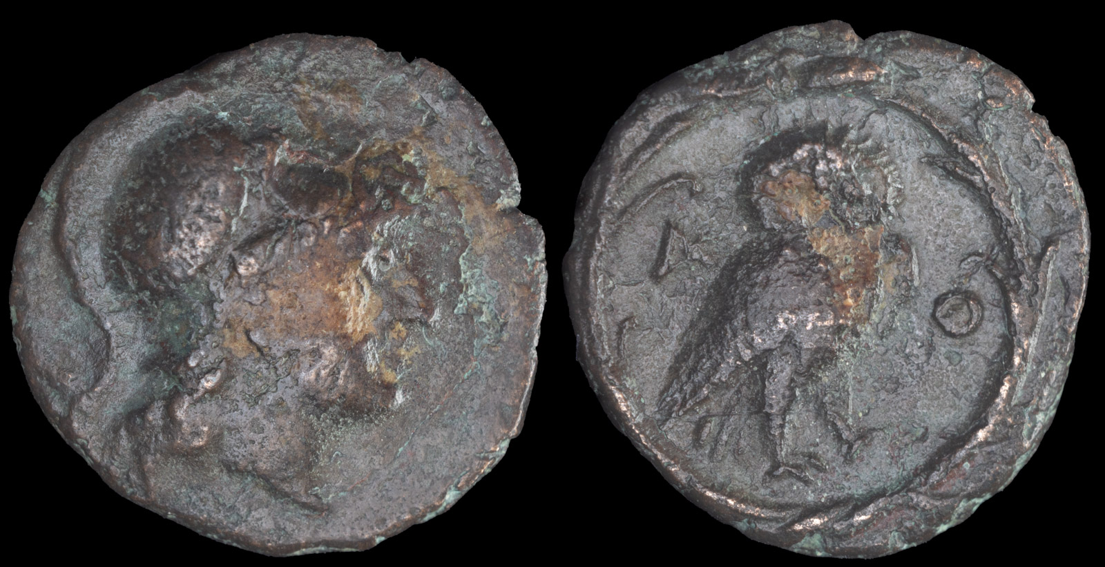Rev: OE. Double-bodied owl stg. on Eleusis ring; in each upper corner, olive spray