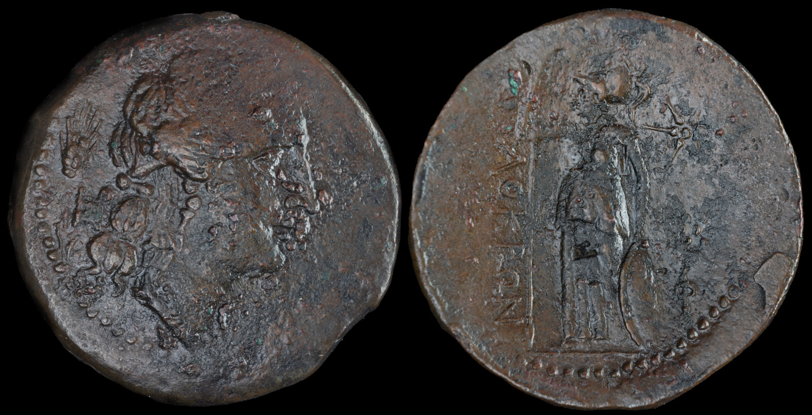 Reverse: ΛOKPÆN, Athena standing left, holding spear in right hand and resting left hand on shield; two stars in right field