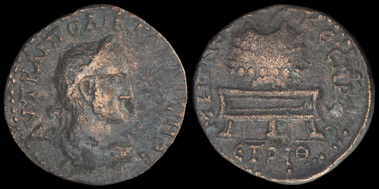 Rev: ΜΗΤ ΝΕΟΚΑΙϹΑΡΙΑϹ, ΕΤ ΡϘΘ. Prize crown from which two palms emerge on base or altar with three legs