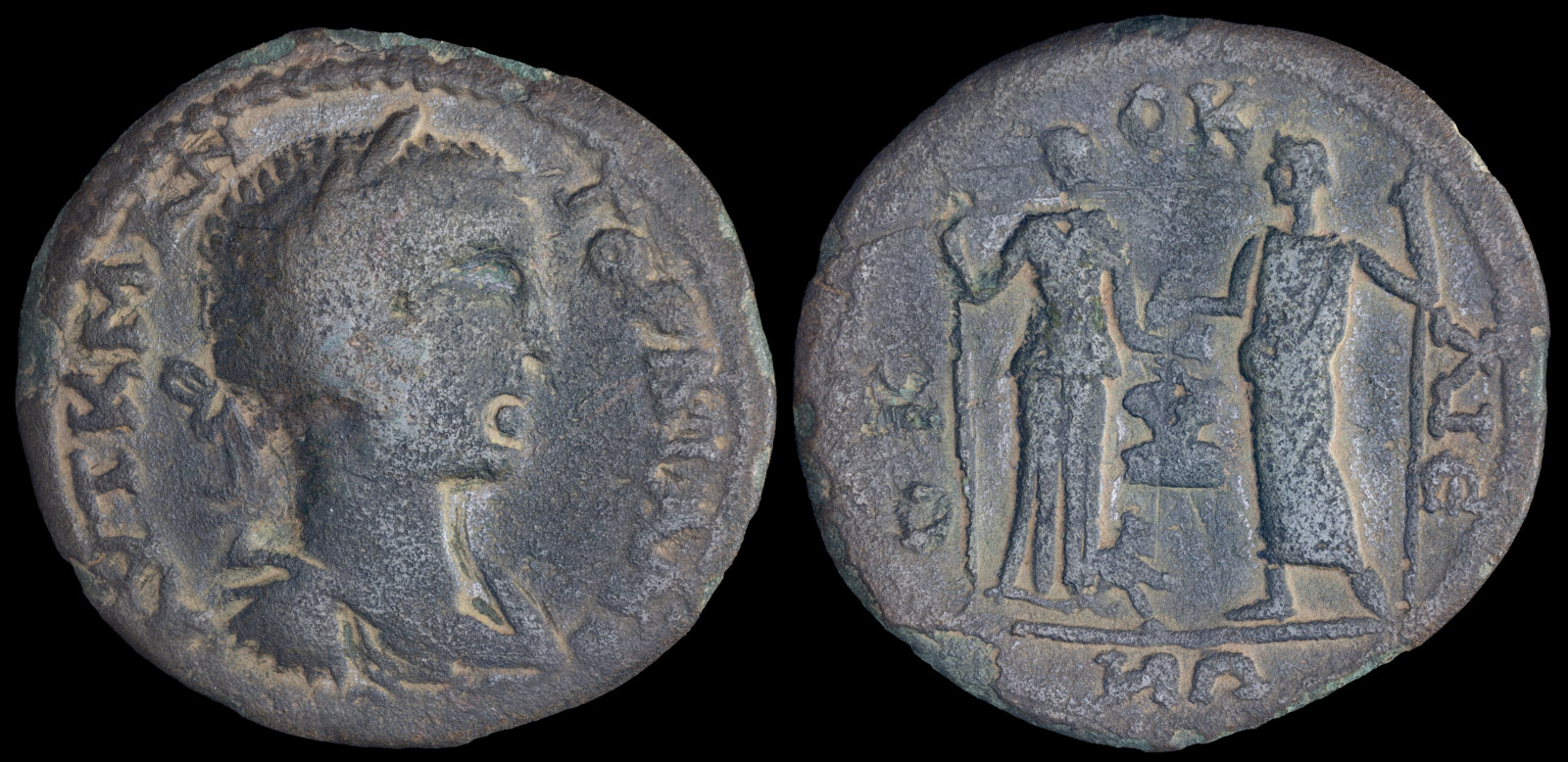 ev. ΟΚ-ΟΚ-ΛΙΕ-ΩΝ Demeter-Kybele and Zeus standing facing each other, Demeter holding scepter and ears of corn, at her feet, lion seated to right, Zeus holding eagle and scepter; betwen them, lighted altar.