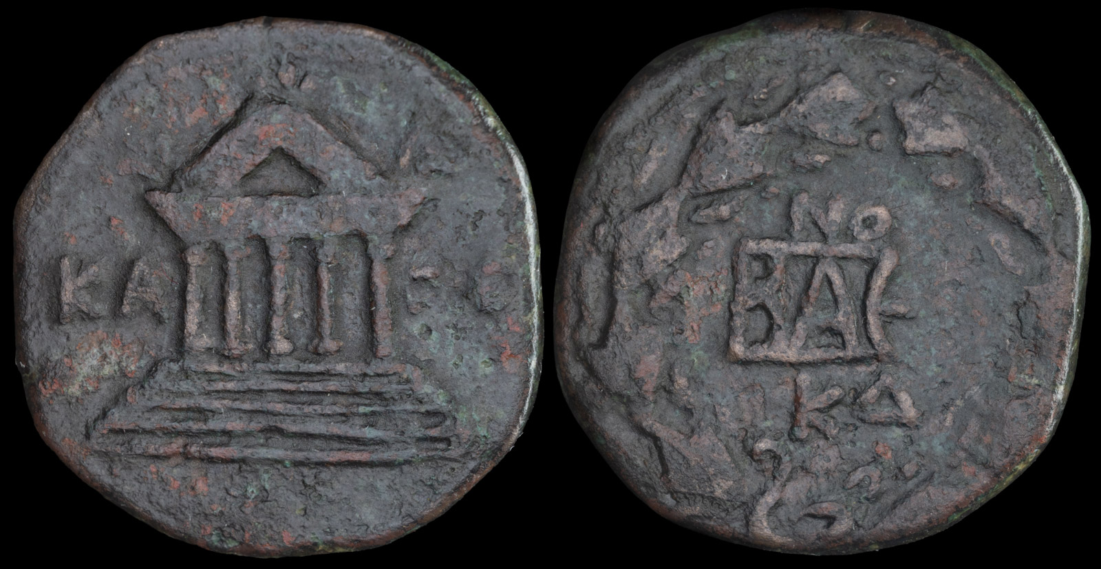 Obv. KA-ΠΕ across fields left to right, temple with five columns.