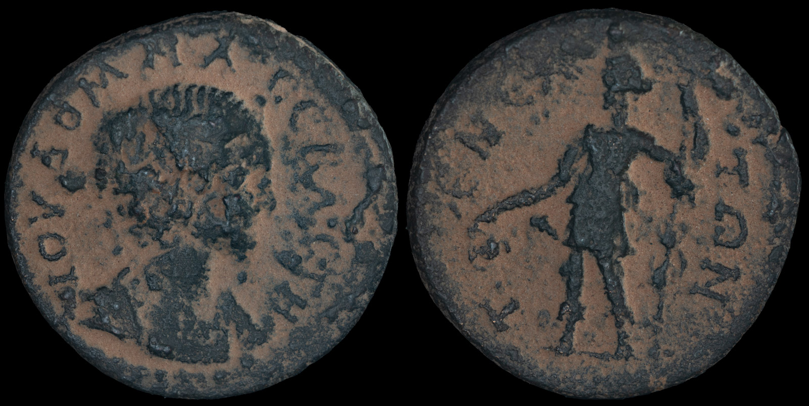 Rev. T-ENEA-TΩN Dionysos standing to left, pouring wine from kantharos with his right hand and holding thyrsos with his left